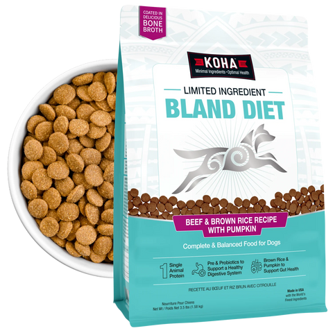 KOHA Limited Ingredient Bland Diet Dry Food is a gentle recipe created with sensitive tummies in mind. This highly digestible dog food has all the benefits of a bland diet, that is convenient, complete and balanced, and ready-to-serve! KOHA Bland Diet is a limited ingredient dog food, which means KOHA uses only one animal protein per recipe to minimize the risk of food allergies. This sensitive stomach food for dogs is made with chicken, brown rice, and pumpkin to support healthy stools and regularity. It's free from junky fillers like potatoes, corn, soy, animal by-products, or artificial flavors or preservatives that can cause digestive upset. And every bite is coated with delicious bone broth, which gives an irresistible taste that dogs love!