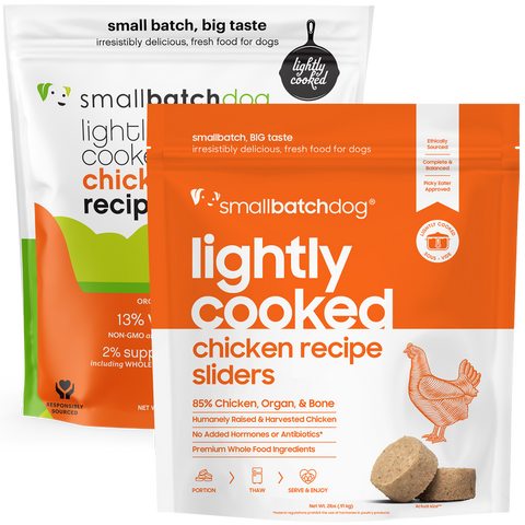 Small Batch's same pristine ingredients, combined in a dog formula and gently cooked sous vide style. They place their classic batches in water baths, bringing the internal temperature up to 150F for just 5 minutes. By gently cooking their batches this way, they're ensuring pasturization making it easier for delicate tummies. Optimal nutrition in a slider, ideal for sensitive systems.